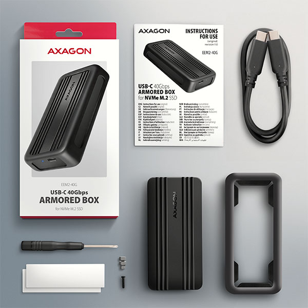 V balení najdete veškeré příslušenství pro snadnou instalaci a rychlé uvedení do provozu, včetně USB-C 40Gbps kabelu o délce 36 cm, teplovodivých podložek a montážního materiálu se šroubovákem pro instalaci M.2 SSD disku. Součástí balení je také silikonový návlek pro ochranu externího boxu a ilustrovaný návod, který vás provede montáží krok za krokem.