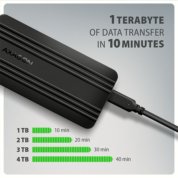 Zdlouhavé kopírování velkých souborů nebo limity běžných flash disků dokáží výrazně zpomalit vaši práci. Díky USB4 rozhraní s rychlostí až 40 Gb/s tento NVMe box výrazně zkracuje dobu přenosu dat a umožňuje plynulejší práci bez zbytečných prodlev. Srdcem boxu je špičkový čipset ASMedia ASM2464PD, který udržuje stabilní rychlost i při vysokém zatížení a dlouhodobém používání. Při použití rychlého NVMe SSD lze přenést až 1 TB dat přibližně za 10 minut (v závislosti na výkonu disku a hostitelského zařízení).