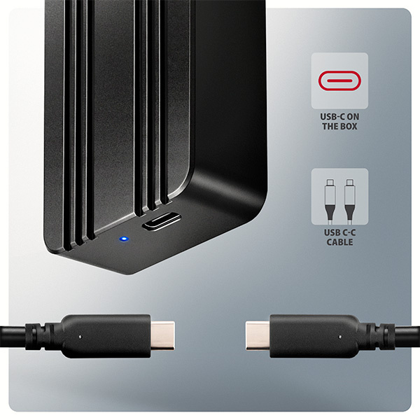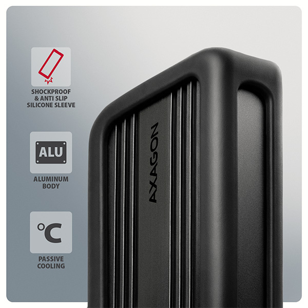 Hliníkové tělo a promyšlený thermal design boxu fungují jako účinný pasivní chladič, který odvádí teplo z SSD disku a pomáhá udržet stabilní výkon bez zpomalování vlivem „Thermal Throttling“. Pomáhá tak udržovat teplotu disku na bezpečné úrovni i při vyšším zatížení. Pasivní chlazení vyniká oproti aktivnímu (s ventilátorem) naprosto tichým provozem, spolehlivostí a energetickou úsporností. Silikonový návlek chrání externí box proti nárazům, omezuje klouzání po stole a zvyšuje komfort při používání.