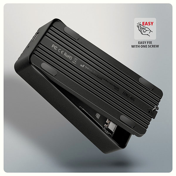Otevírání pomocí jednoho šroubku umožňuje rychlou instalaci i výměnu M.2 NVMe SSD disku. Vnitřní konstrukce zajišťuje snadné vložení i pevné uchycení. Samozřejmostí je Plug & Play provoz bez nutnosti instalace ovladačů. Ideální řešení pro rychlý přenos dat mezi zařízeními i rozšíření úložiště.