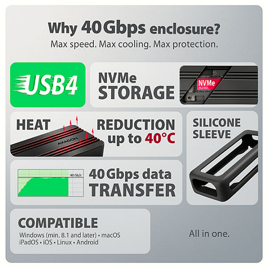 Rychlý externí AXAGON EEM2-40G ARMORED box s USB4 rozhraním umožňuje využít vysoký výkon M.2 NVMe SSD disků s minimálním throttlingem a stabilním provozem. Přenosová rychlost až 40 Gb/s a široká kompatibilita včetně Thunderbolt rozhraní z něj dělají spolehlivé řešení pro náročné použití, například při práci s MacBookem. Odolné hliníkové tělo slouží zároveň jako pasivní chladič a spolu se silikonovým návlekem chrání zařízení při každodenním používání. Záloha až 1 TB dat za přibližně 10 minut, střih 4K videa přímo z externího disku nebo využití staršího NVMe SSD jako rychlého přenosného úložiště, to vše zvládnete s jedním zařízením. Součástí balení je USB-C 40Gbps kabel.