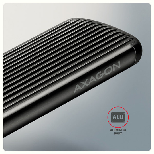 Žebrovaný design a hliníkový plášť boxu zajistí velmi dobré chlazení vloženého M.2 SSD disku. Prodlužuje se tak jeho životnost a také je zamezeno zpomalování rychlosti disku tzv. „Thermal Throttling“. Vnější kovový plášť je proveden v černé barvě a brání nežádoucím otiskům prstů.