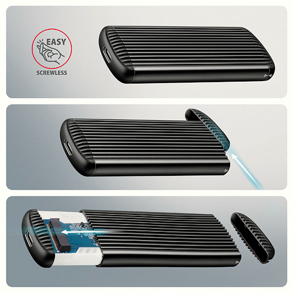 Bezšroubové otevírání usnadňuje montáž i demontáž M.2 SSD disku. Díky tomu je výměna disků rychlá a snadná a výrazně urychluje práci při migraci dat, testování, klonování či rozšiřování úložiště.