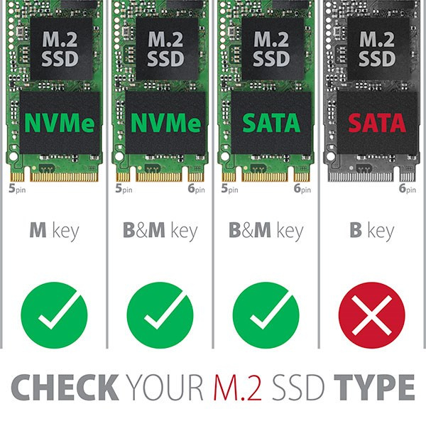 Unikátní vlastností, díky novému čipsetu, je možnost použití jak M.2 NVMe tak i SATA disků. Nemusíte tak přemýšlet jaký typ M.2 disku do boxu vložíte. Výhodou je uchycení rovnou pro tři různé délky SSD karet - 42, 60 a 80 mm. M.2 karty mohou být jednostranné nebo oboustranné. Box nemá omezení kapacity vloženého SSD disku.