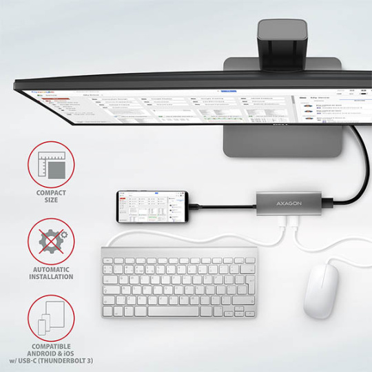 USB-C hub je ideálním doplňkem pro notebooky bez USB-A konektorů a video výstupu. Lze tak využít Vaše stávající USB periferie bez nutnosti pořizování nových. Díky funkcím Plug and Play a Hot Plug je samotné zapojení hubu velmi jednoduché bez složité instalace, a také lze jednoduše připojovat a odpojovat periferie za běhu počítače. Rozbočovač se nezalekne ani připojení k telefonům s USB-C konektorem. K telefonu tak připojíte například flash disk, klávesnici, myš, monitor, TV nebo projektor.