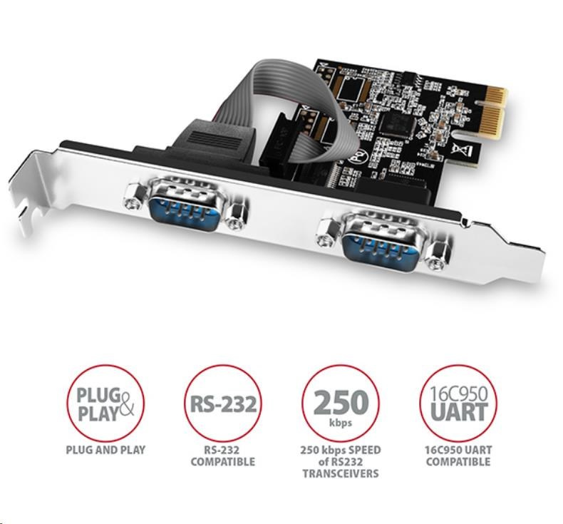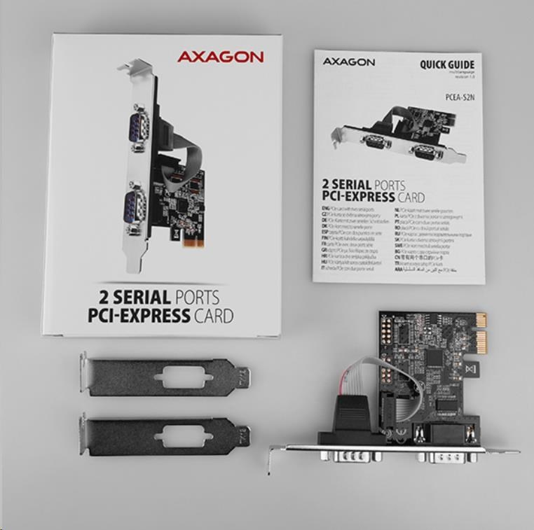 PCI-Express karta AXAGON PCEA-S2N rozšíří stolní počítač o dva sériové RS-232 porty s DB-9 konektory.