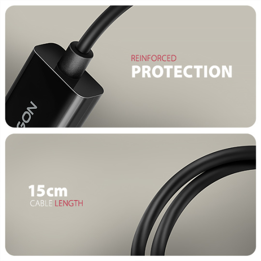 Redukce je vyrobena z kvalitních materiálů, které zajišťují vysokou spolehlivost. Kabel i konektory jsou chráněny proti zalomení, což prodlužuje jejich životnost. Adaptér navíc disponuje 15cm flexibilním kabelem pro snadnější manipulaci.