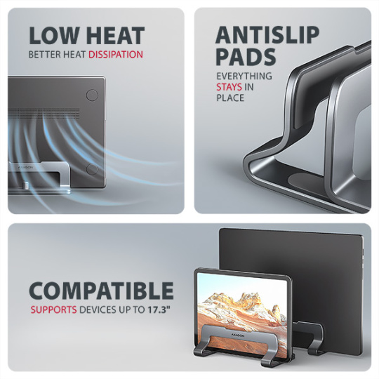 AXAGON STND-VG, vertikální hliníkový stojan pro notebooky 10"-17.3, nastavitelný rozestup, šedý