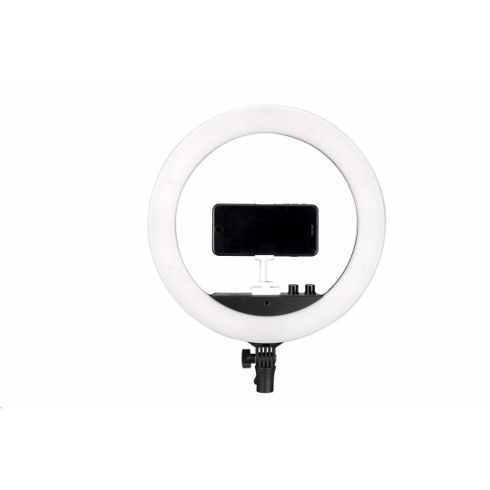 Stmívatelné dvoubarevné LED kruhové světlo Nanlite Halo 14 s napájením pomocí AC adaptéru. Součástí balení je také držák na telefon, make-up zrcátko, přepravní pouzdro a světelný stativ.