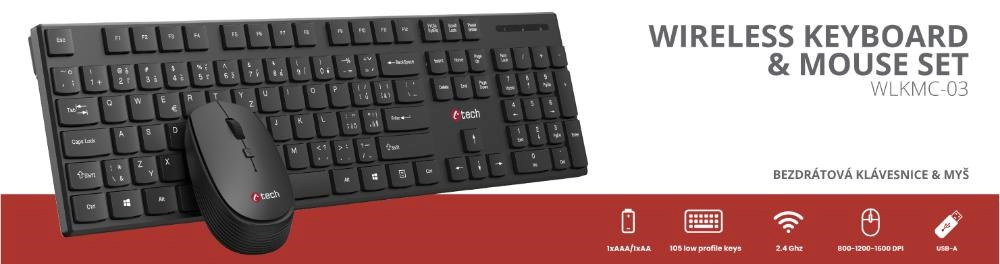 BAZAR - C-TECH klávesnice s myší WLKMC-03, Bezdrátový set 2.4GHz, CZ, Černá, rozbaleno