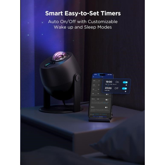 Govee Star Light Projector nabízí praktické časovače, které lze snadno nastavit prostřednictvím aplikace Govee Home. Tato funkce vám umožní předem naplánovat, kdy se projektor zapne nebo vypne, což je ideální pro automatické vytvoření uklidňující atmosféry před spaním nebo pro časově nastavené světelné show během večerních aktivit. Nastavení časovačů v aplikaci je intuitivní a rychlé, což vám poskytuje maximální pohodlí a kontrolu nad provozem projektoru, aniž byste museli cokoli ručně ovládat.