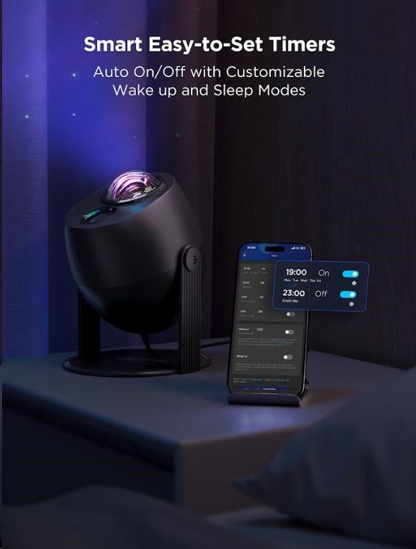 Govee Star Light Projector nabízí praktické časovače, které lze snadno nastavit prostřednictvím aplikace Govee Home. Tato funkce vám umožní předem naplánovat, kdy se projektor zapne nebo vypne, což je ideální pro automatické vytvoření uklidňující atmosféry před spaním nebo pro časově nastavené světelné show během večerních aktivit. Nastavení časovačů v aplikaci je intuitivní a rychlé, což vám poskytuje maximální pohodlí a kontrolu nad provozem projektoru, aniž byste museli cokoli ručně ovládat.