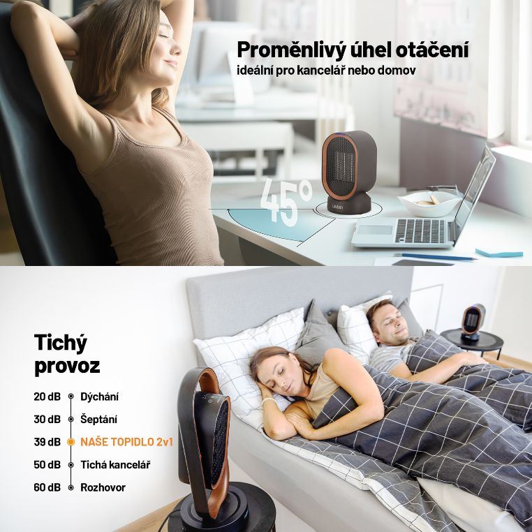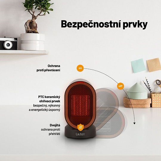 Zatopí vám, ale umí být i chladnýDopřát si příjemné teploučko, kdykoliv pociťujete přílišné dotírání paní zimy, je teď snazší, než by se mohlo zdát. Nemusíte hned zapínat topení, stačí povolat do akce Lauben Desk Fan&Heater 2in1 600BB. Tento malý, ale šikovný krasavec o výkonu 600 W ukrývá PTC keramické topidlo zajišťující energeticky efektivní výkon. Zároveň je jeho provoz bezpečný, a to i díky pojistce proti přehřátí a převržení. Bezlopatkové provedení neohrožuje děti ani domácí mazlíčky. Bez problémů vytopí až 10 m2 a umí se natáčet v úhlu 45°. Se stejnou vervou se však pouští i do chlazení. Přepnutím na mód větráku přirozeně prouděním vzduchu ochladíte místnost. Avšak řešení 2v1 provedené v high end Lauben designu vás chladnými nenechá.