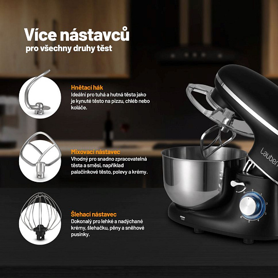 Kuchyňský robot Lauben Kitchen Machine 550BC klame tělem. Není žádný obr, zato jeho výkonný motor o síle 1400 W si poradí i s nejtužšími těsty. Stejně snadno tak připravíte piškotové těsto nebo chlebové. Zátěž pomáhají přístroji zvládat celokovové převody a použitý materiál zaručuje dlouhou životnost. Jakmile se pustíte do vaření, není třeba troškařit, mísa z prémiové nerezové oceli pojme až 5,5 l. Bez problémů tak připravíte i hostinu pro rodinu nebo sešlost s přáteli.