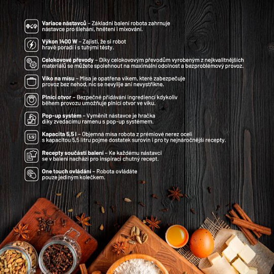 Šéf kuchyně, který vám usnadní práciVaření a pečení se stane ještě větší zábavou, s víceúčelovým kuchyňským robotem Lauben Kitchen Machine 550BC o výkonu 1400 W vše zvládnete snadno a rychle. Netřeba se bát ani přípravy tužších těst, celokovové převody si s vysokou zátěží poradí. Mísa o objemu 5,5 l z nerezové oceli pojme opravdu hodně a víko brání úniku obsahu při zpracování. Suroviny lze během provozu přidávat skrze plnicí otvor ve víku. Při všem, co dokáže, je robot menších rozměrů a nezabere tak na lince příliš místa. Svým designem ji však bude i zdobit. Přístroj pohodlně ovládáte jednou rukou díky One Touch systému, manipulaci usnadňuje také Pop-up systém sloužící k výměně nástavců. Robot disponuje hned několika nástavci, pro míchání, šlehání či hnětení a ke každému z nich naleznete v balení chutný recept pro inspiraci.