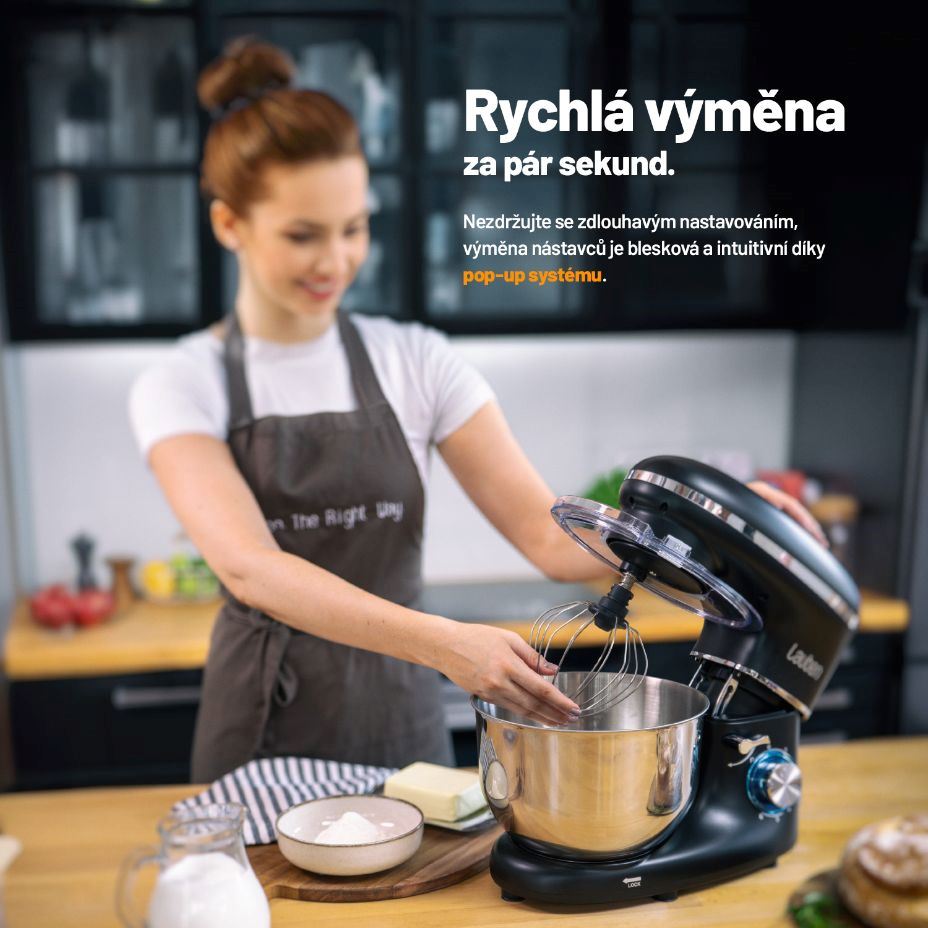 Šéf kuchyně, který vám usnadní práciVaření a pečení se stane ještě větší zábavou, s víceúčelovým kuchyňským robotem Lauben Kitchen Machine 550BC o výkonu 1400 W vše zvládnete snadno a rychle. Netřeba se bát ani přípravy tužších těst, celokovové převody si s vysokou zátěží poradí. Mísa o objemu 5,5 l z nerezové oceli pojme opravdu hodně a víko brání úniku obsahu při zpracování. Suroviny lze během provozu přidávat skrze plnicí otvor ve víku. Při všem, co dokáže, je robot menších rozměrů a nezabere tak na lince příliš místa. Svým designem ji však bude i zdobit. Přístroj pohodlně ovládáte jednou rukou díky One Touch systému, manipulaci usnadňuje také Pop-up systém sloužící k výměně nástavců. Robot disponuje hned několika nástavci, pro míchání, šlehání či hnětení a ke každému z nich naleznete v balení chutný recept pro inspiraci.