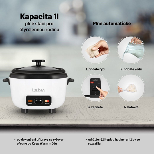 Uvařit vláčnou a nadýchanou rýži je často mnohem těžší, než by se mohlo zdát. S rýžovarem Lauben je to ale stejně jednoduché, jako si tuto oblíbenou přílohu vychutnat. Jeho využití je všestranné, připravíte v něm jakýkoli druh rýže přesně al dente, stisknutím jednoho tlačítka. Ale poradí si i s jinými surovinami. Během několika minut za vás zvládne lahodné polévky, krémovou cereální kaši nebo luštěniny bohaté na bílkoviny. Samozřejmostí je funkce Keep warm, díky které je rýžovar schopný udržet rýži teplou tak dlouho, jak potřebujete, aniž by se rozvařila a ztratila dokonalou chuť nebo strukturu.