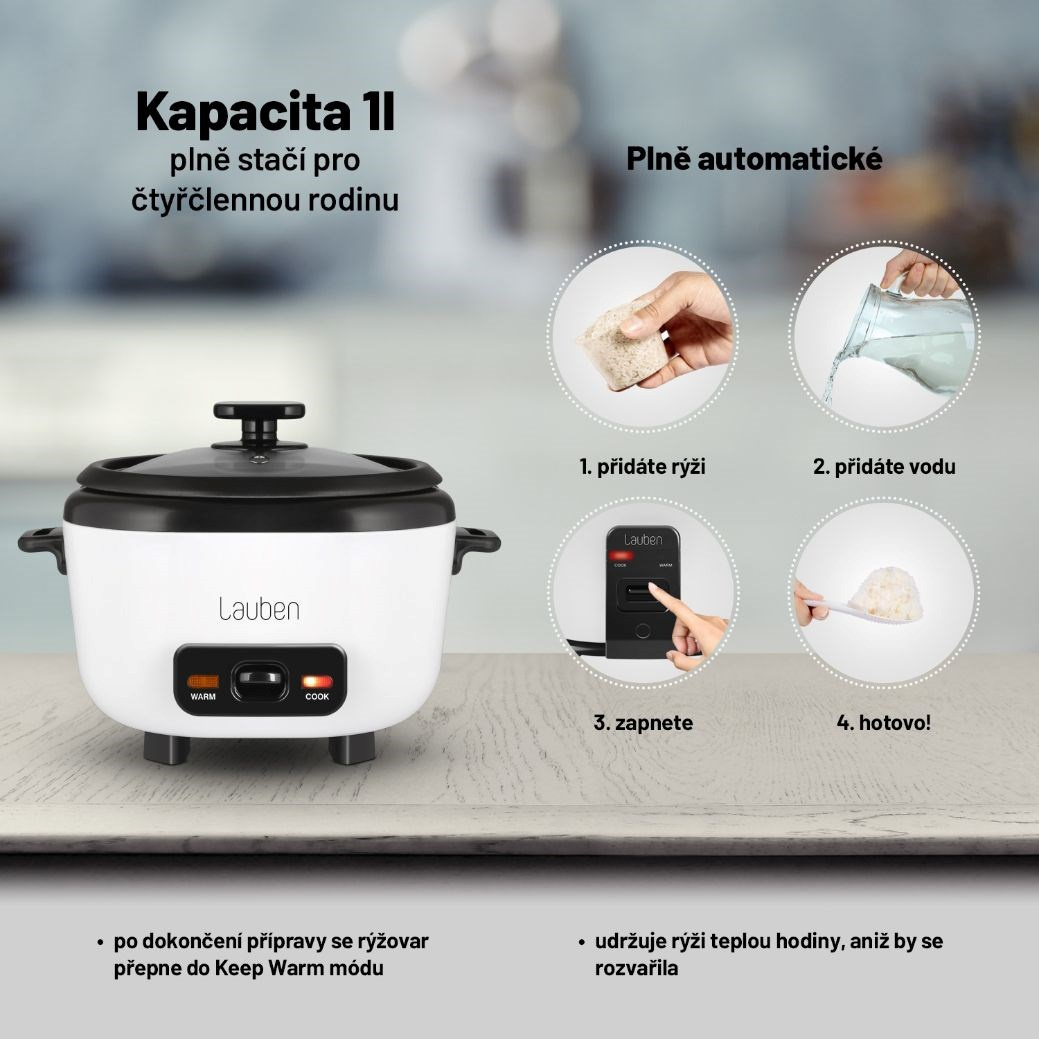 Uvařit vláčnou a nadýchanou rýži je často mnohem těžší, než by se mohlo zdát. S rýžovarem Lauben je to ale stejně jednoduché, jako si tuto oblíbenou přílohu vychutnat. Jeho využití je všestranné, připravíte v něm jakýkoli druh rýže přesně al dente, stisknutím jednoho tlačítka. Ale poradí si i s jinými surovinami. Během několika minut za vás zvládne lahodné polévky, krémovou cereální kaši nebo luštěniny bohaté na bílkoviny. Samozřejmostí je funkce Keep warm, díky které je rýžovar schopný udržet rýži teplou tak dlouho, jak potřebujete, aniž by se rozvařila a ztratila dokonalou chuť nebo strukturu.