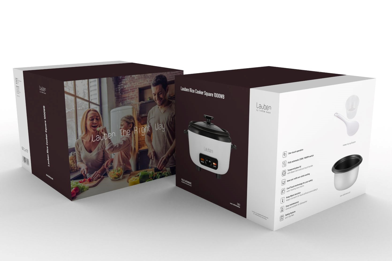 Oproti ostatním rýžovarům je Lauben Rice Cooker Square 1000WB příkladem skvělé kombinace funkčního a stylového designu. Nejen, že dobře vypadá, ale díky svému hranatému tvaru je zároveň kompaktní a snadno se skladuje. Poklice rýžovaru je z tvrzeného skla, tudíž máte lepší kontrolu nad stavem připravovaného jídla. Zároveň je opatřena otvorem pro únik přebytečné páry. Samozřejmostí jsou protiskluzové nožičky, díky kterým rýžovar vždy zůstane na svém místě. Povrch vnitřní nádoby rýžovaru je nepřilnavý, takže rýži můžete připravovat bez tuku, a přesto se nikdy nepřipálí. Technologie Cool touch zase zajistí, že se o něj nikdy nespálíte vy.