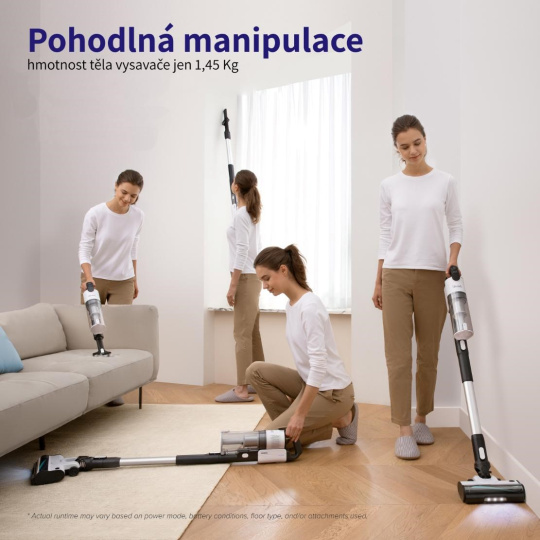 Vysavač je vybavený 180 W bezkartáčovým motorem, který pohání 2200 mAh baterie. Díky kombinaci moderního motoru a velké baterie je vysavač je tak nejen tichý, ale hlavně vydrží pracovat opravdu dlouho. Při běžném úklidu vydrží vysávat až 50 minut, a to stačí na úklid celého prostoru. Motor má 100.000 otáček a poradí si tak i s těžšími nečistotami jako je písek a jiný venkovní materiál.