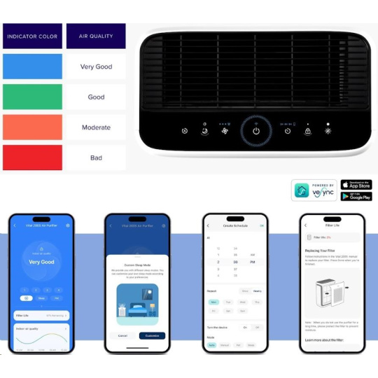 Chytrou čističku vzduchu Levoit Vital 200S PRO můžete ovládat přímo na displeji nebo také přes aplikaci určenou pro smartphony a tablety Android a Apple. V aplikaci si můžete nastavit různé režimy, výkon, sledovat proces čištění, úroveň znečištění vzduchu nebo kondici, v jaké se filtr nachází. Ovládaní hlasem je možné přes Alexa a Google Assistant.