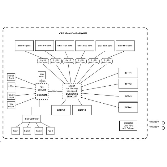 CRS354-48P-4S+2Q+RM is extremely functional, and it has the best price-point on the market – it will make the perfect addition to a professional setup. The total non-blocking throughput is 168 Gbps, switching capacity is 336 Gbps and the forwarding rate reaches 235 Mpps