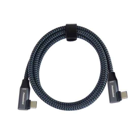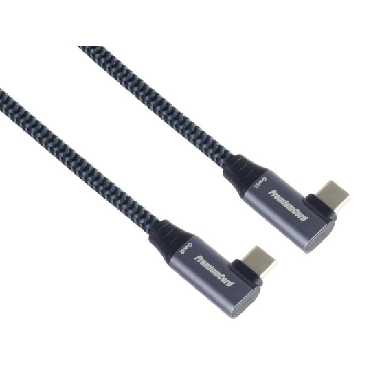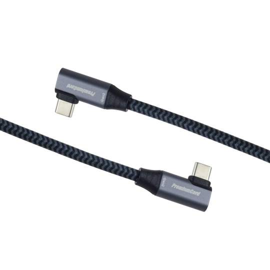 PremiumCord USB-C 2x zahnutý 90° kabel ( USB 3.2 GEN 2x2, 5A, 100W, 20Gbit/s ) hliníkové krytky konektorů, bavlněný oplet, 0,5m
