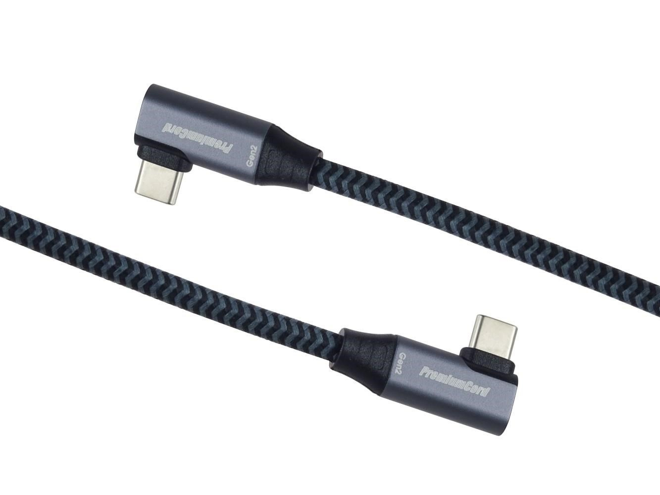 PremiumCord USB-C 2x zahnutý 90° kabel ( USB 3.2 GEN 2x2, 5A, 100W, 20Gbit/s ) hliníkové krytky konektorů, bavlněný oplet, 0,5m