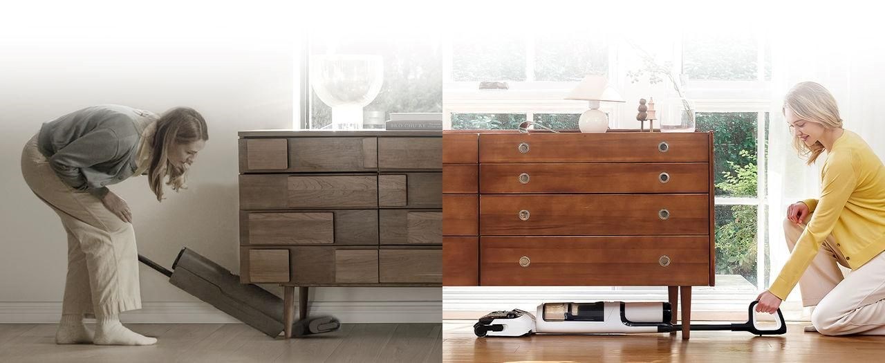 S výškou pouhých 13 cm ve sklopené poloze se Tineco FLOOR ONE S5 STRETCH Extreme snadno dostane i pod nízký nábytek, kde běžné přístroje nestačí. Lehká konstrukce a maximální ovladatelnost umožňují snadný pohyb bez nutnosti stěhování.