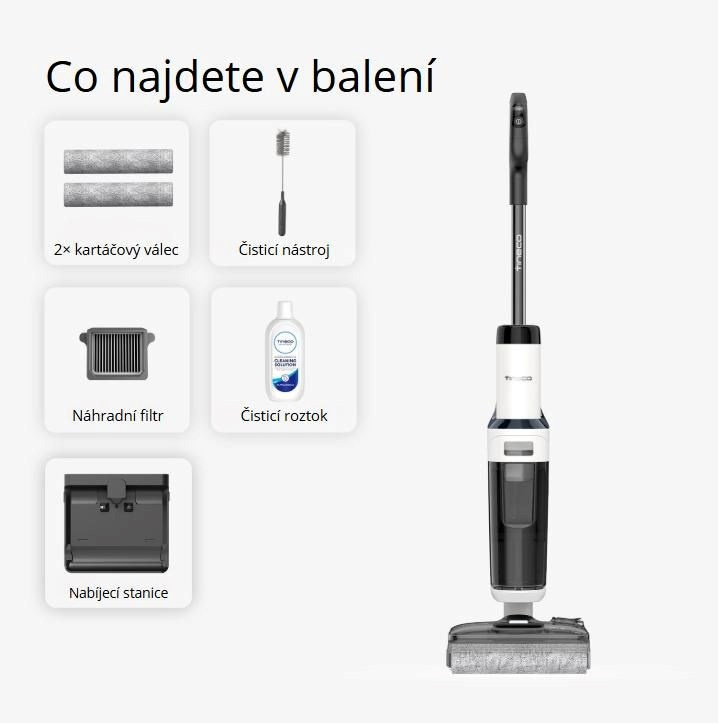 Součástí balení je originální čisticí roztok Tineco DeoClean Solution, který zvyšuje účinnost úklidu – zejména u silně znečištěných míst.