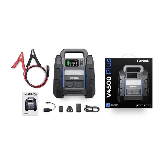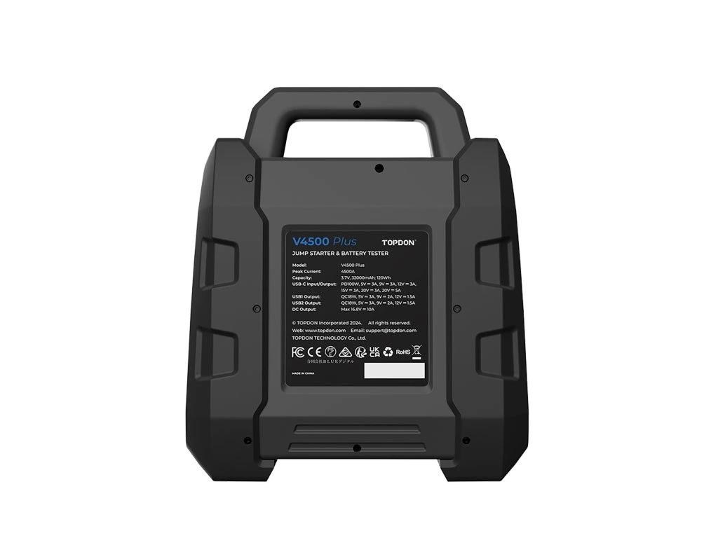 Jump startér TOPDON V4500 Plus nabízí dokonalé řešení napájení pro vozidla s velkým objemem, jako jsou návěsy a přívěsy. Se špičkovým proudem 4500 A je speciálně navržen pro automobily s napětím 12 V a je vhodný pro benzínová a dieselová vozidla s objemem motoru až 16 litrů.