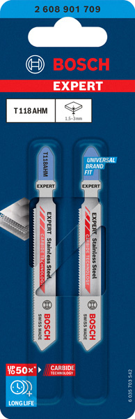Vydrží až 50× déle v odolných materiálech než pilový plátek Bosch T118G - Řezání plechů z nerezové oceli je každodenním úkolem pro kovodělníky. Je běžné i při montáži kuchyní a stavbě průmyslových či kancelářských budov. Profesionálové, kteří se této práci věnují, potřebují spolehlivý plátek, který se nepoškozuje. Jen tak se lze vyhnout frustraci z neustálé výměny plátků. Pilový plátek EXPERT Stainless Steel je optimalizován pro nejtvrdší kovy a má rozteč zubů odpovídající tloušťce plechů, které zpracováváte. Extrémní odolnost tohoto plátku zaručuje karbidové technologie Bosch Carbide Technology – ozubení z nejtvrdšího kovu je k tělu přivařeno laserem. Řeže nejodolnější plechy extrémně efektivně a nabízí tu nejlepší životnost. Pilový plátek Bosch EXPERT Stainless Steel na tenké materiály se dodává ve dvou verzích: Pilový plátek T118 AHM pro řezy do tenkého plechu má velmi jemnou rozteč zubů. Verze T118 EHM se střední roztečí ozubení je pak nejlepší volbou pro řemeslníky, kteří chtějí řezat středně silné plechy z nerezové oceli té nejvyšší pevnosti nebo a tenkostěnné trubky. Kompatibilní se všemi pilami s upínáním do T.