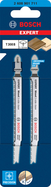 Velmi čistý řez horní i spodní strany - Zajistit, aby na viditelné části obráběného materiálu byla „čistá strana řezu“, bylo mezi truhláři a tesaři vždycky umění. Někdy můžete obrobek otočit, jindy lze držet přímočarou pilu vzhůru nohama. Nebo můžete použít plátek EXPERT Wood 2-side clean, který díky dvěma řadám zubů nabízí perfektní řez bez otřepů na obou stranách. Důmyslná konstrukce těchto pilových plátků pro přímočaré pily znamená, že po řezání již není potřeba žádná další práce – zuby zabraňují otřepu materiálu jak při zdvihu, tak při sestupu pily. To je ideální pro profesionály, kteří chtějí ušetřit čas a zároveň poskytovat svým klientům práci nejvyšší kvality. Se svými velmi ostrými a přesně broušenými zuby je pilový plátek Bosch EXPERT Wood 2-side clean vhodný pro řezání měkkého dřeva do tloušťky 50 mm. Nábytkáři mohou získat perfektní povrch a neztrácet čas broušením po každém řezu přímočarou pilou. K dispozici pro rovné řezy (T308B), pro křivkové řezy (T308BO) a pro přesné úhlové řezy (T308BP). Kompatibilní se všemi pilami s upínáním do T.
