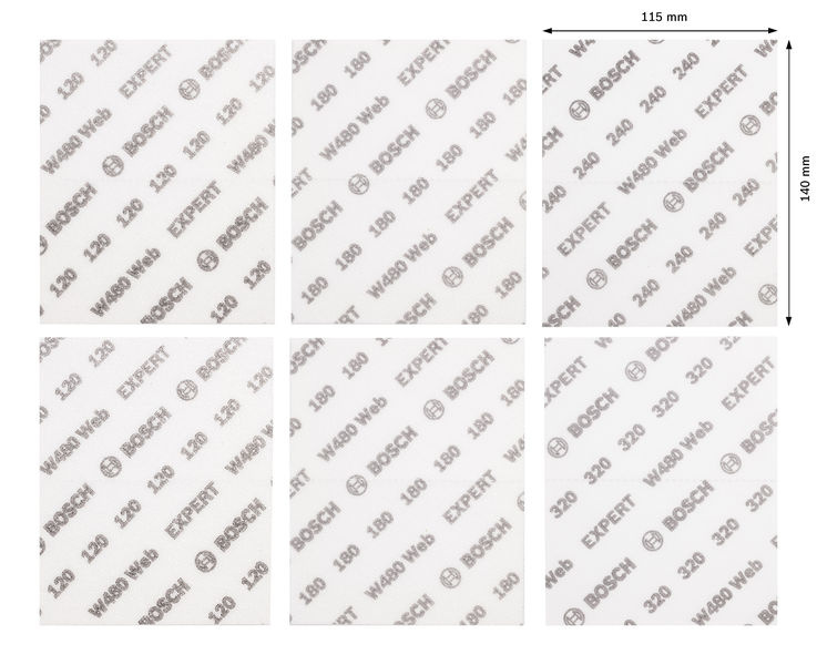 Bosch sada ručních brusných sítí EXPERT W480 Web 1/4, 115 × 140 mm, G120 (2×); G180 (2×); G240 (1×); G320 (1×), 6 ks