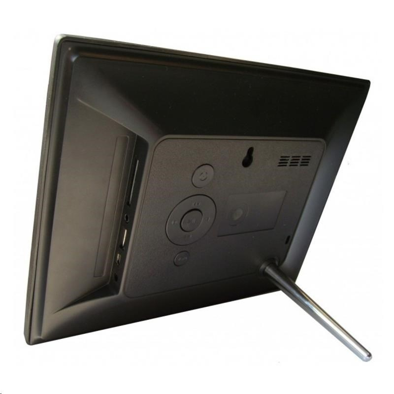 Digitální fotorámeček s úhlopříčkou 8", LED backlight, rozlišení 1024x768px, poměr 4:3, prohlížení obrázků JPEG, poslech hudby MP3 a přehrávání videa HD 720p, multislot SDHC/MS, USB2 pro FlashStick, mini USB2, Audio out, IR dálkový ovladač, barva: černá. Auto Start, OSD menu, SlideShow, Zoom, otáčení obrázků, kontrast/ světelnost/ barevnost, budík, hodiny, kalendář. TFT LCD, uhlopříčka 20,3cm, světelnost 300 cd/m2, kontrast 300:1. Formáty Foto: JPEG, MBP, GIF, TIP, PNG - Video: MPEG 1/2/4 (Divx4.0/5.0, Xvid), AVI, M-JPEG, MKV, WMV, ASF, MOV, MP4, H.264, 3GP - Audio: MP3, WMA, OGG, AAC, APE, FLAC, WAV. Možnost uchycení na zeď nebo našrobování stojánku, výstup sluchátka, síťový zdroj AC/DC 5V/1,5A, rozměr: 220x176x23 mm, hmotnost 440 g..