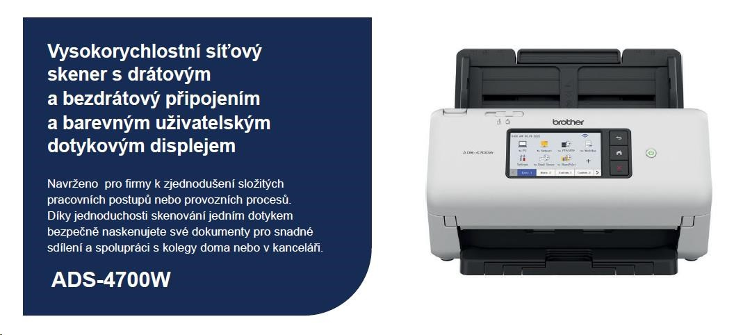 BROTHER skener ADS-4700W DUALSKEN A4 40pppm/80dual 600x600 60ADF USB LAN WIFI - display 10.5cm
