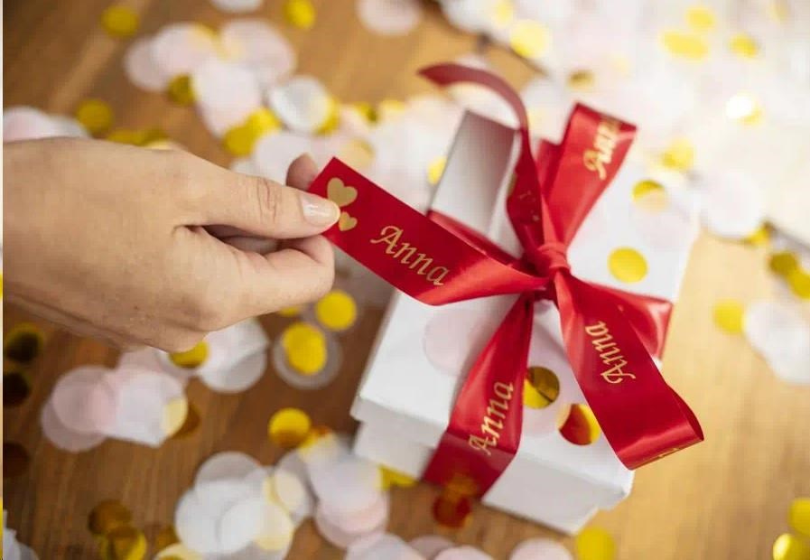 BROTHER TZE-RW54 - kazeta TZ šířky 24mm, TEXTILNÍ páska 4m- pro tvorbu dárků - NELEPÍCÍ -ČERVENÁ PÁSKA ZLATÝ POTISK gold