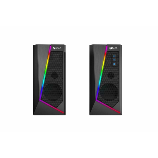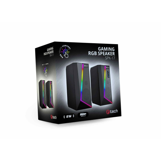 Stolní PC reproduktory C-tech SPK-17 s elegantním designem a decentním RGB osvětlením se stanou stylovým doplňkem každého pracovního stolu. Díky 40mm měničům s širokým frekvenčním rozsahem dopřejí vašim uším velmi kvalitní reprodukci. RGB osvětlení disponuje 6 různými světelnými režimy, které vám zaručí originální vizuální zážitky. Volba režimu je velmi jednoduchá a to dotykem na horní ploše řídícího reproduktoru. Reproduktory připojíte k počítači pomocí 3,5mm audio kabelu a nemusíte si dělat starosti ani s přídavným napájením, protože reproduktory C-tech SPK-17 jsou napájené přímo z USB vašeho počítače a tak se Vám automaticky spustí či vypnou společně s počítačem či notebookem. K ovládání hlasitosti poslouží tlačítka nacházející se na jednom z reproduktorů. Společně s ovládáním hlasitosti, je možno stiskem dalšího tlačítka vypnout RGB podsvětlení reproduktoru.