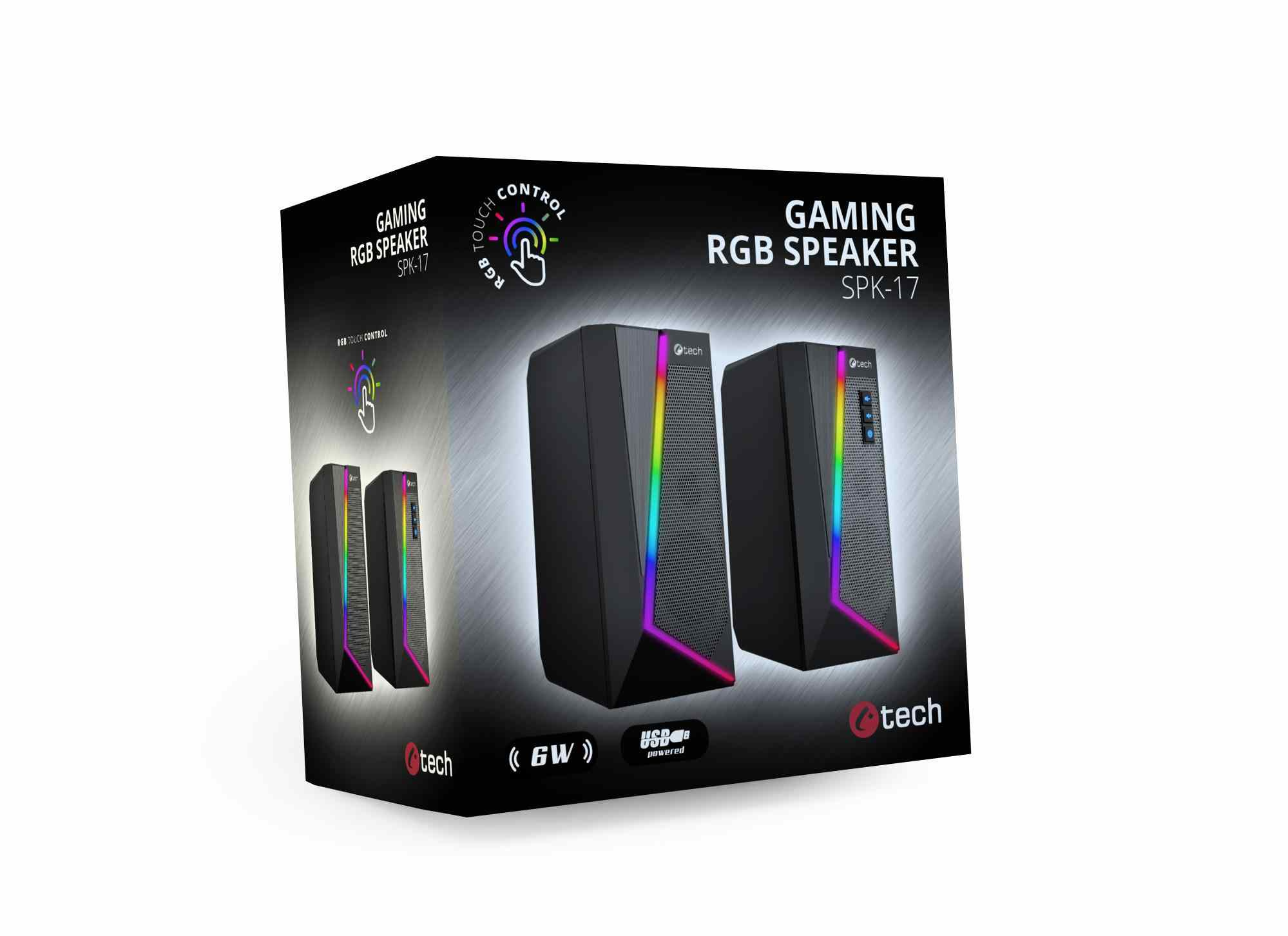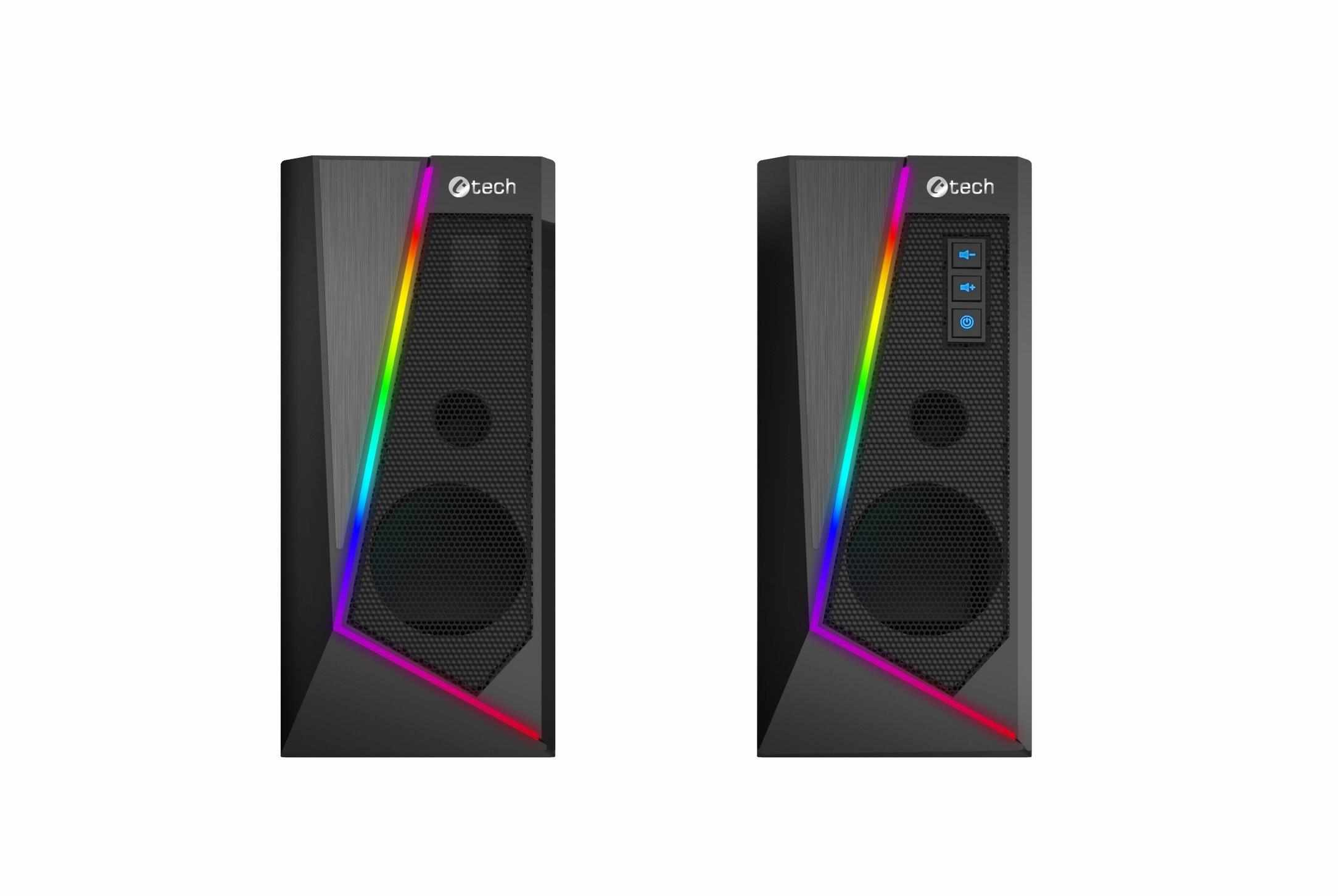 Stolní PC reproduktory C-tech SPK-17 s elegantním designem a decentním RGB osvětlením se stanou stylovým doplňkem každého pracovního stolu. Díky 40mm měničům s širokým frekvenčním rozsahem dopřejí vašim uším velmi kvalitní reprodukci. RGB osvětlení disponuje 6 různými světelnými režimy, které vám zaručí originální vizuální zážitky. Volba režimu je velmi jednoduchá a to dotykem na horní ploše řídícího reproduktoru. Reproduktory připojíte k počítači pomocí 3,5mm audio kabelu a nemusíte si dělat starosti ani s přídavným napájením, protože reproduktory C-tech SPK-17 jsou napájené přímo z USB vašeho počítače a tak se Vám automaticky spustí či vypnou společně s počítačem či notebookem. K ovládání hlasitosti poslouží tlačítka nacházející se na jednom z reproduktorů. Společně s ovládáním hlasitosti, je možno stiskem dalšího tlačítka vypnout RGB podsvětlení reproduktoru.