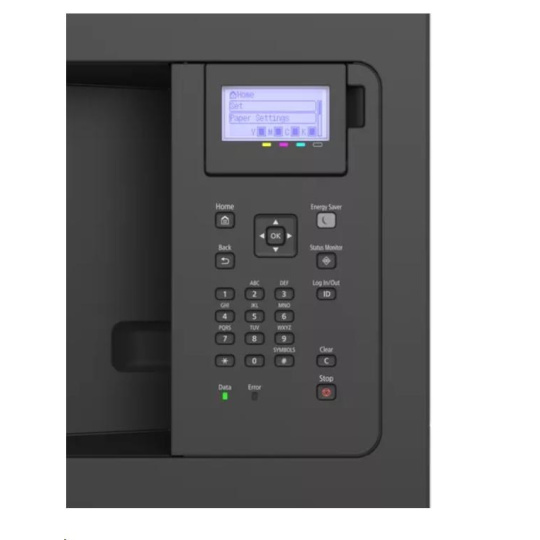 - Ovládací panelDisplej LCD s 5 řádky, 5 indikátorů LED (Online, Ready, Message, Job a Energy saver), tlačítka, číselná klávesnice s 10 tlačítky