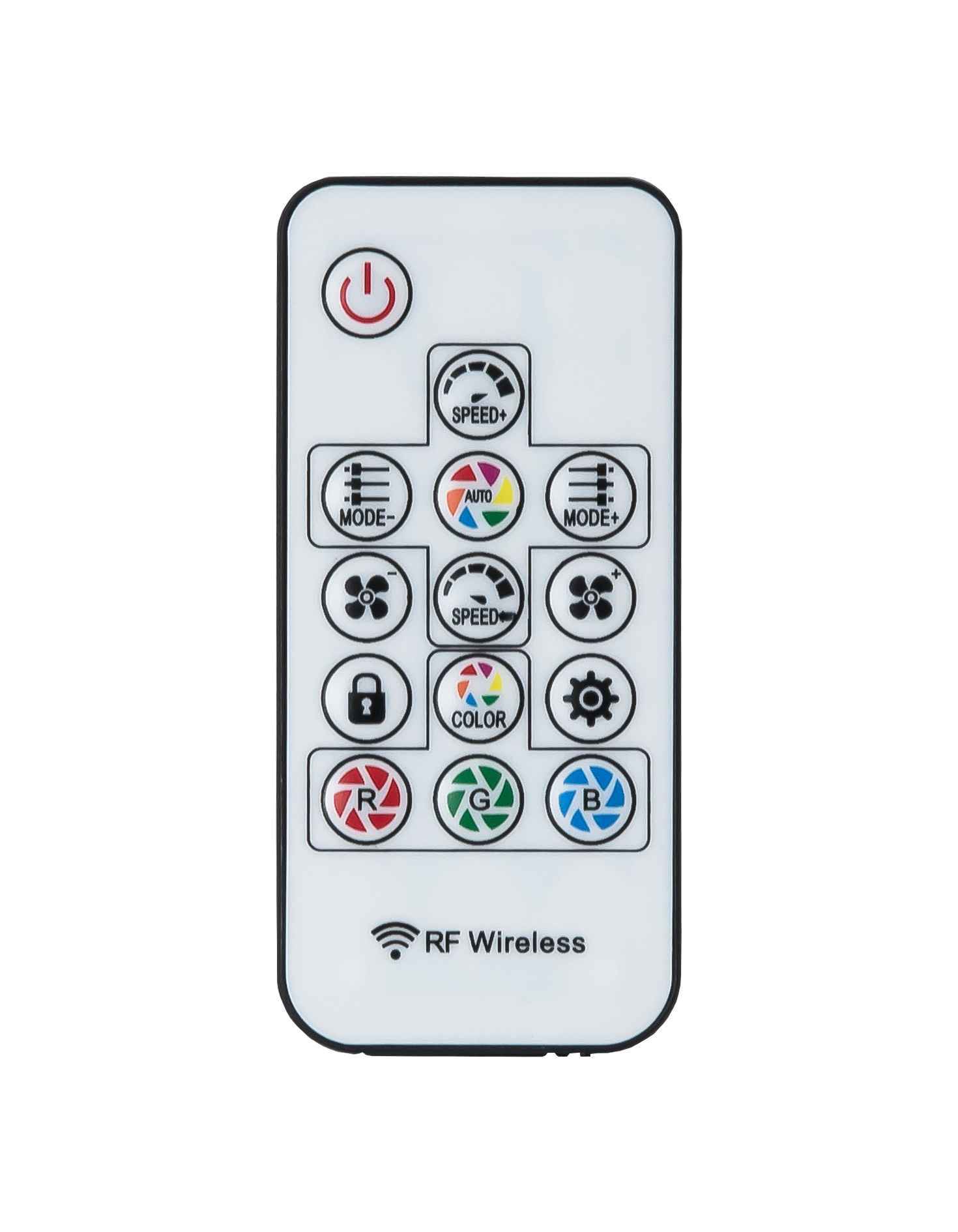 The new CF-3012-RGB 3-RGB fan set (Tornado) with a multi-functional control board and an RF remote control easily fulfills and surpasses all lighting expectations of a gamer. Thanks to the included multi-functional controller board, the RGB lighting can be controlled either via mainboard +5V LED header or completely independently, without motherboard by switching with corresponding + 5V LED headers. Each fan is equipped with 16 addressable LEDs and allows an almost infinite RGB effect variety which cannot be realised by a simple and conventional +12V RGB lighting. In addition, each fan is furnished with shock-absorbing and anti-vibration rubbers and designed with special shaped fan blades which guarantee a whisper quiet operation. The white fan blades ensure a uniform illumination. All conventional +5V addressable RGB motherboard technologies such as ASUSTM AURA, ASRockTM RGB Sync, MSITM Mystic Light Sync and GigabyteTM RGB FUSION are supported. The multifunctional hub can be connected to a +5V adressable RGB header. It offers 6x 6PIN fan connectors and 2x 3PIN +5V RGB connectors for other peripherals like LED strips or similar. The color modes and fan speed can also be controlled directly via the function buttons on the controller board which is of course compatible with all CHIEFTEC RGB fans.