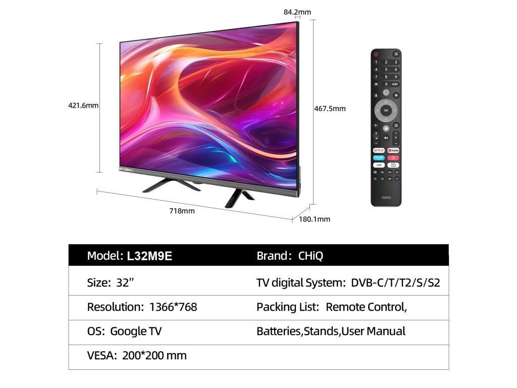 CHiQ L32M9E TV 32", HD, smart, Google TV, Dolby Audio, dbx-tv, HDR 10