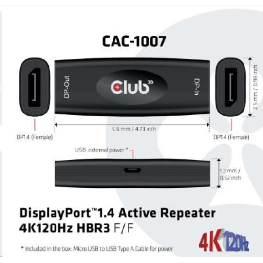 | Product Name: DisplayPort™ 1.4 Active Repeater 4K120Hz HBR3 F/F Product Series: Adapter Itemcode: CAC-1007 EAN code: 8719214471590 UPC code: 841615101788Product Name: DisplayPort™ 1.4 Active Repeater 4K120Hz HBR3 F/F |