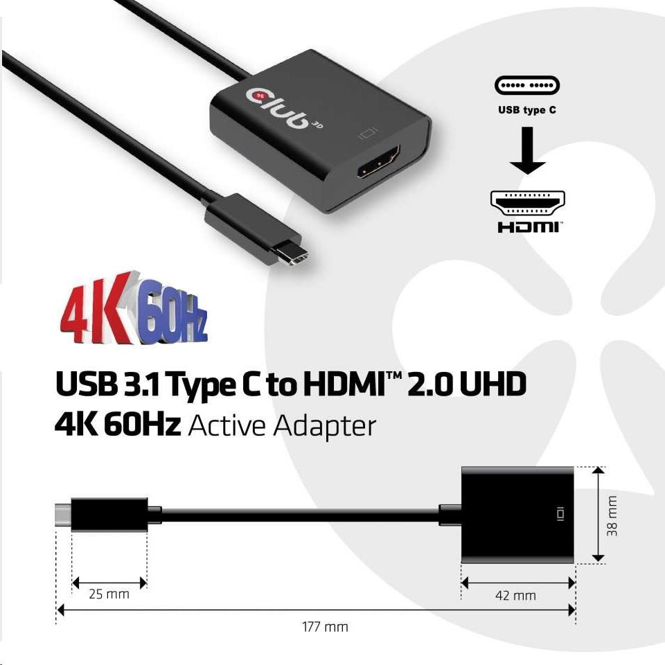 Club 3D CAC-2504 je aktivní převodník signálu HDMI ™. Adaptér USB 3.1 Type C na HDMI ™ 2.0 UHD 4K 60 Hz je nejjednodušším řešením pro připojení zdrojového zařízení, které obsahuje konektor USB 3.1 Type C s alternativním režimem DisplayPort ™ k (U)HD monitoru, televizoru nebo projektoru s rozhraním HDMI ™ 2.0. Adaptér je kompaktní a vysoce přenosný. Napájen portem USB-C, adaptér nevyžaduje žádné externí napájení a je ideální pro použití s notebooky a ultrabooky.