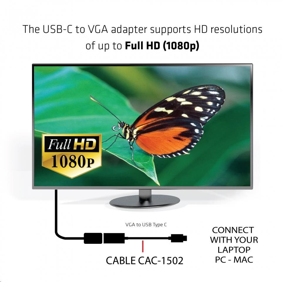 Club 3D CAC-1502 je aktivní převodník signálu VGA. Tento adaptér USB-C na VGA je nejjednodušší řešení pro připojení zdrojového zařízení s rozhraním USB 3.1 typu C s alternativním režimem DisplayPort ™ k monitoru nebo projektoru s rozhraním VGA. Adaptér je kompaktní a vysoce přenosný. Napájen přes USB-C port, adaptér nevyžaduje žádné externí napájení a je také ideální pro použití s notebooky a ultrabooks.