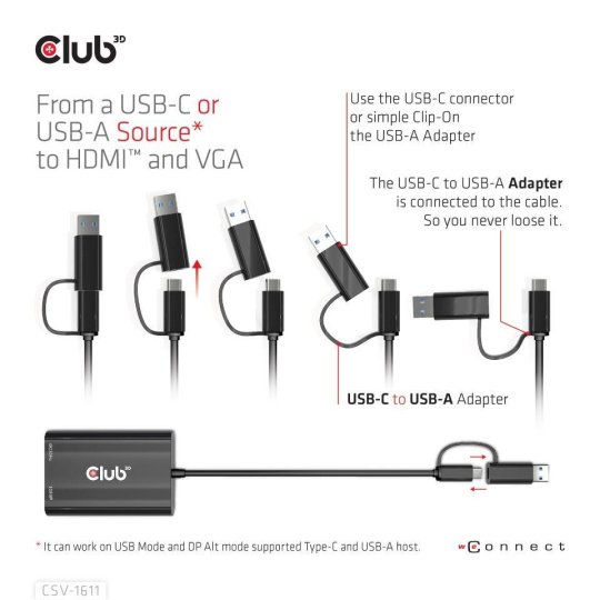 The Club 3D CSV-1611 USB Gen1 Type-C/-A to Dual HDMI™ (4K/30Hz) and VGA (1080/60Hz) adapter is a Dual Display adapter which provides most advanced, efficient solution to extend a single USB Type-C or Type-A port to HDMI™ and VGA displays. It supports single HDMI™ 4K/30Hz and VGA 1080P/60Hz or dual 4K/30Hz + VGA 1080P/60Hz simultaneous output of different videos. It can work on USB Mode and DP Alt mode supported Type-C and USB-A host. Dual Video output on MacBook with M1. Support USB Gen1 with max 5Gbps data transmission. The unit is powered thru the USB Type-A or Type-C host connection. No external power needed.