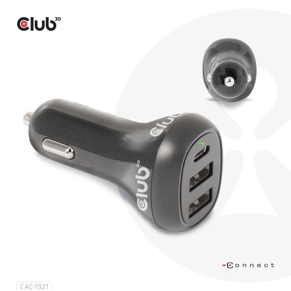 Produkt Club 3D CAC-1921 je vysoce výkonná nabíječka do auta s módním designem. S touto nabíječkou můžete nabíjet jakákoli zařízení (např.: digitální fotoaparáty, PDA, mobilní telefony, USB příslušenství) s autem, když je to potřeba. Je vybaven třemi USB konektory (jeden konektor USB Type-C a dva konektory USB Type-A) pro napájení. Tento produkt umožňuje nabíjení tří zařízení současně a produkt poskytuje maximální výkon 36 wattů. Port USB Type-C je speciálně navržen pro zařízení podporovaná Type-C. Ujistěte se prosím, že používáte kabely se správným výkonem od Club 3D. Doporučujeme používat minimálně 60W kabely, abyste se ujistili, že optimálně využíváte výhody této nabíječky. Je to užitečné a pohodlné použití!