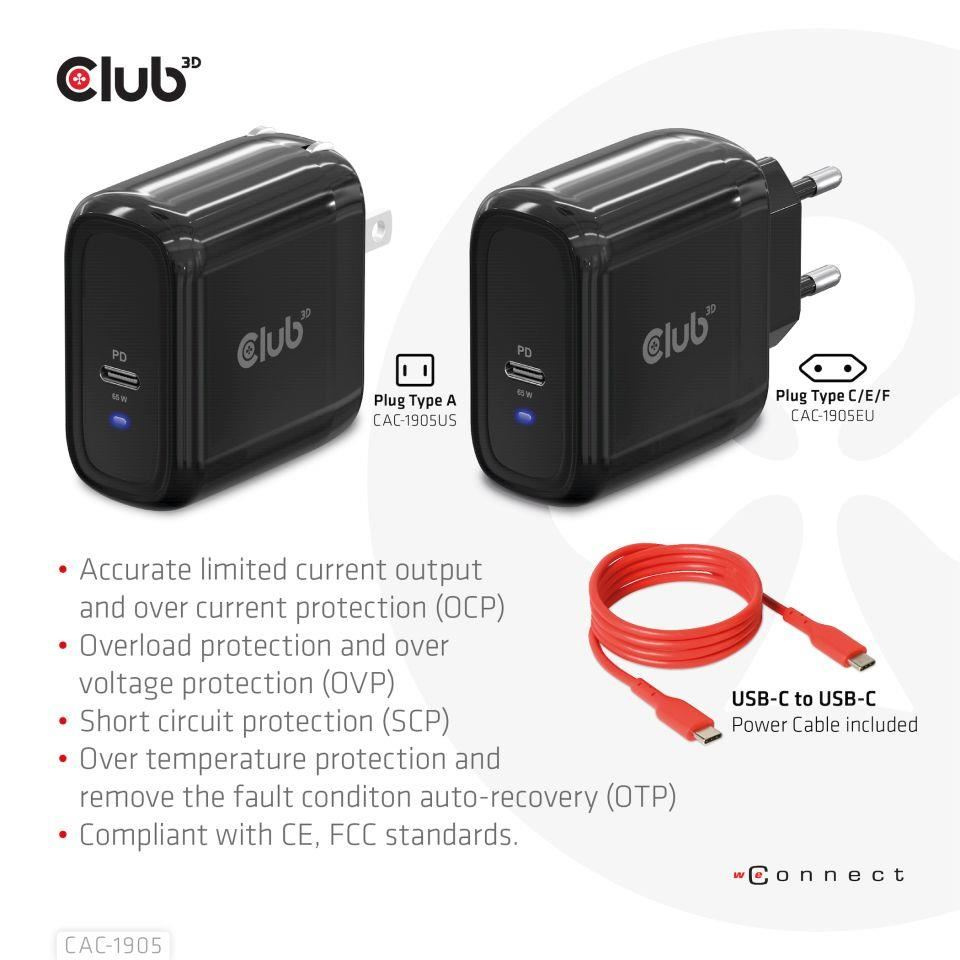 The Club3D CAC-1905 Travel Charger PPS 65W GAN technology, Single port USB Type-C, Power Delivery(PD) 3.0 Support. Compact size & Superior Performance: GAN technology chipset makes this charger 50% smaller than a 65W MacBook chager, small enough to carry anywhere.The Programmable Power Supply(PPS) 65W wall charger match a variety of PD devices from smart phones to laptops, one for all making charging simple. This wide compatibility charger will be your convenient companion during your business trip or vacation.