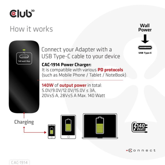 | In the box | • CAC-1914 Travel Charger 140 Watt GaN technology, Single port USB Type-C, Power Delivery(PD) 3.1 Support |
