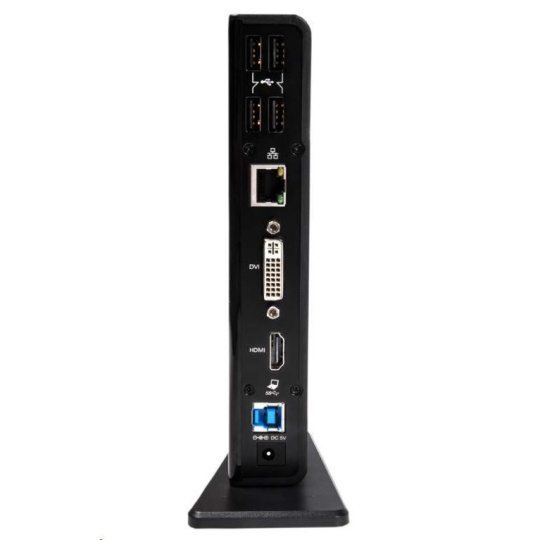 Díky čipu DisplayLink ™ DL-3900 je možné k dokovací stanici připojit dva externí monitory s vysokým rozlišením prostřednictvím výstupů HDMI ™ a DVI-I. Má ethernetový port RJ 45 pro spolehlivé a rychlé drátové připojení k síti a nabízí celkem 6 portů USB pro periferie a paměťové zařízení, stejně jako výstup zvuku a mikrofonu. To vše je připojeno k vašemu zařízení pomocí jediného kabelu USB.